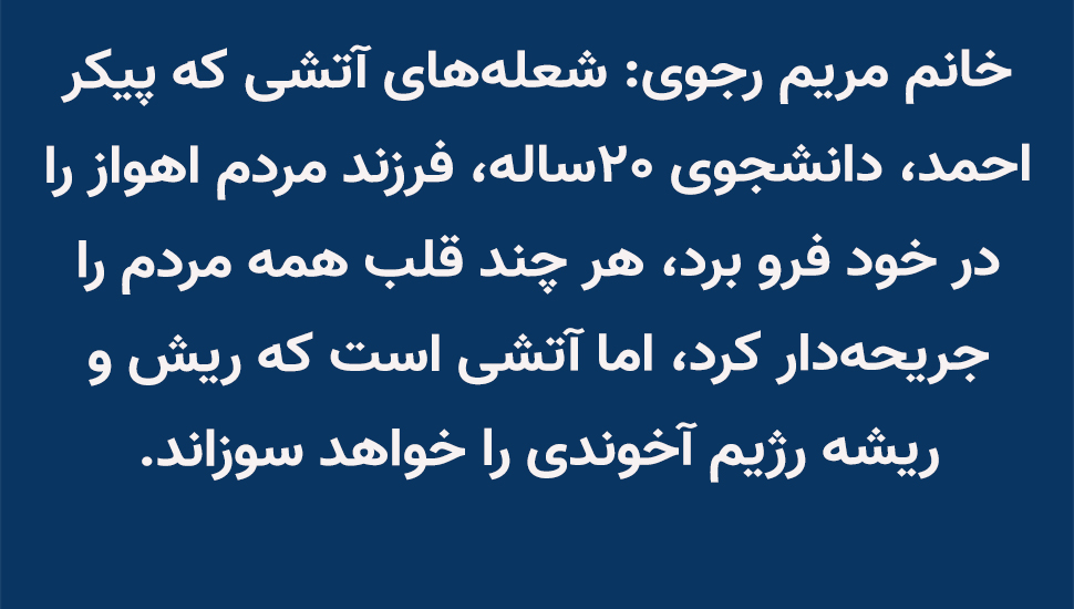 خانم مریم رجوی: شعله‌های آتشی که پیکر احمد، دانشجوی ۲۰ساله، فرزند مردم اهواز را در خود فرو برد، هر چند قلب همه مردم را جریحه‌دار کرد، اما آتشی است که ریش و ریشه رژیم آخوندی را خواهد سوزاند.